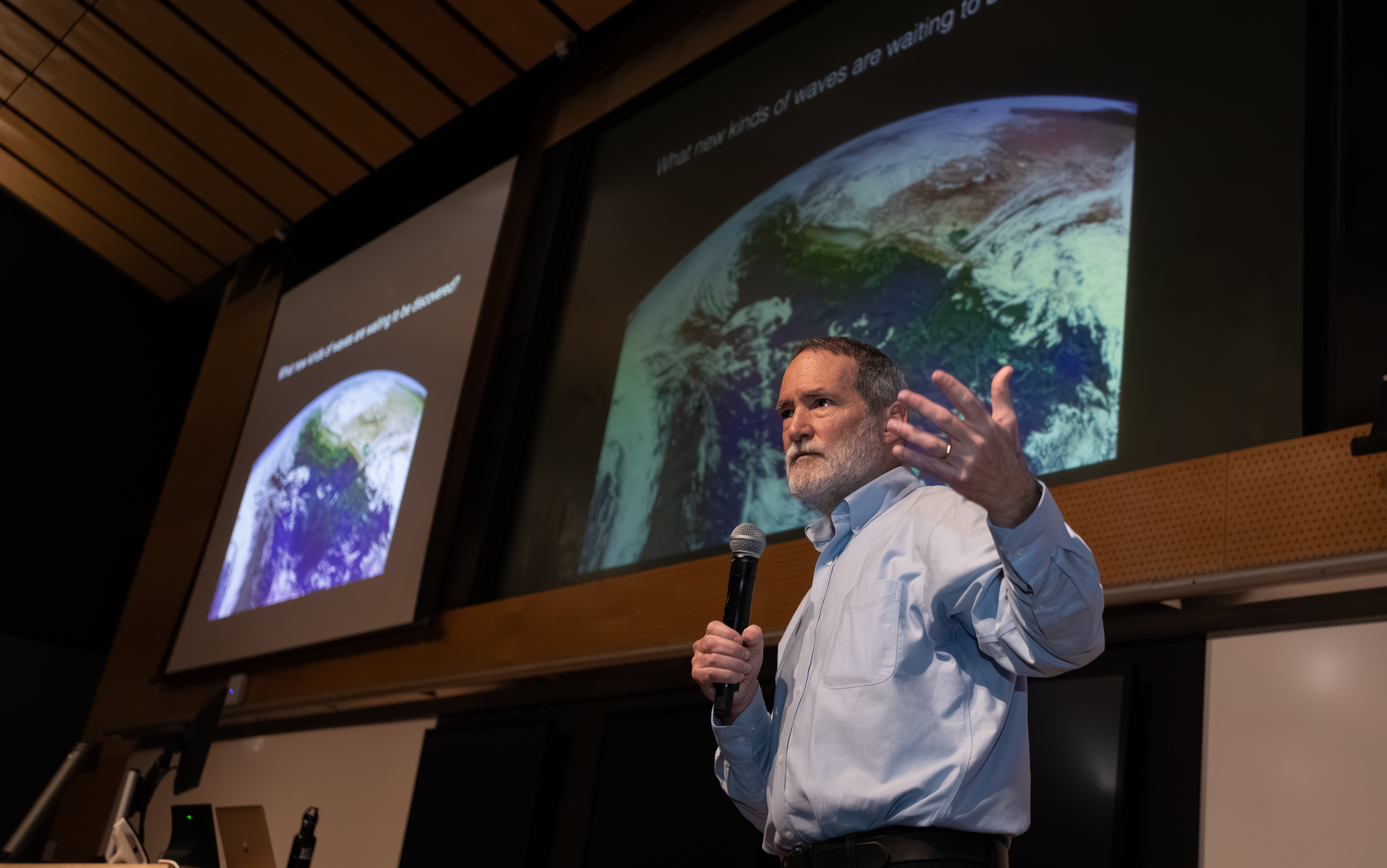 In his lecture, titled “Waves are everywhere: how oscillations shape technology, earth, and the universe,” Marston discussed how waves connect phenomena across vast ranges of scale, how they have transformed technology and science, and how emerging topological waves may point toward discoveries still to come.