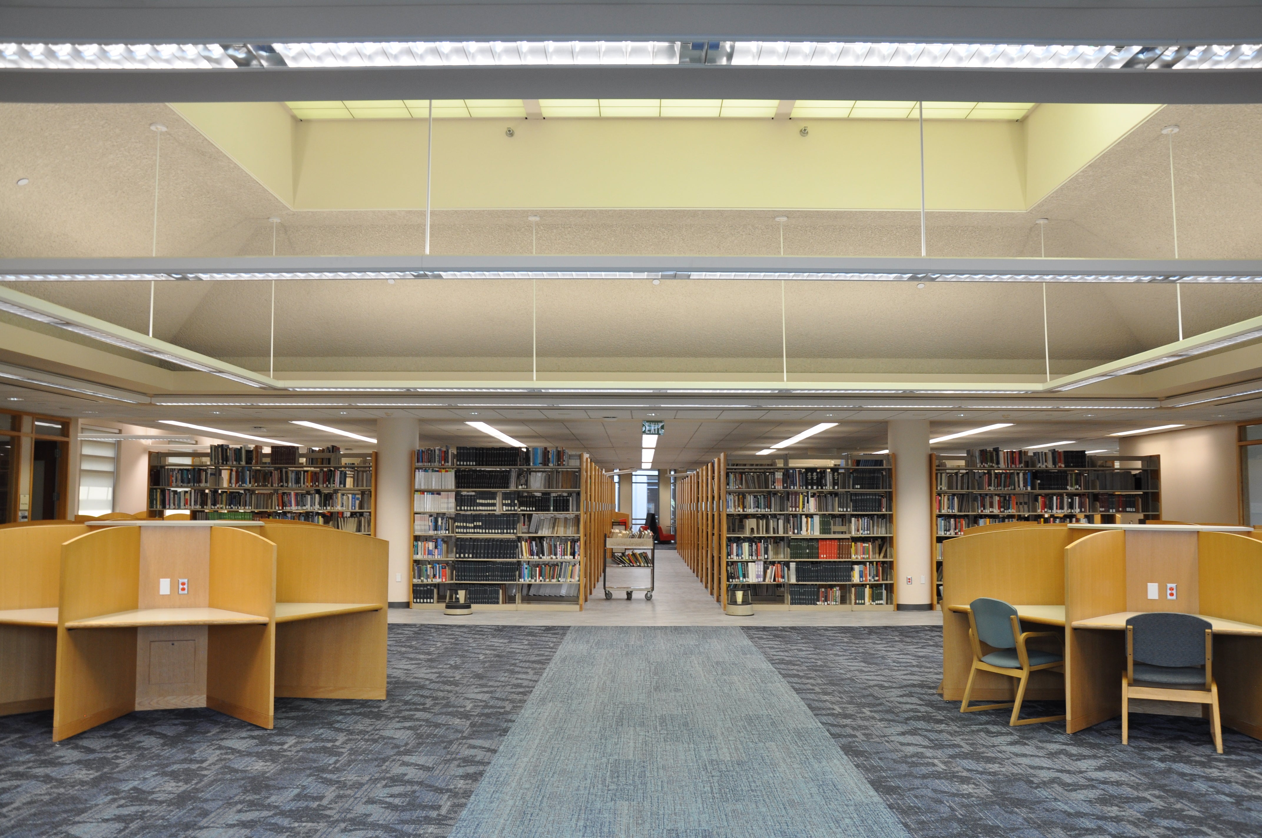The renovations included replacing ceiling tiles and repairing drywall, both of which had suffered water damage, and repainting the walls. New carpet and flooring were also installed. Upholstered green armchairs on all three floors of the library were professionally cleaned.